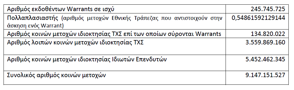 Συνεπώς, τα εκδοθέντα warrants που παραμένουν σε ισχύ ανέρχονται σε 245.745.725 ενώ οι μετοχές της τράπεζας επί των οποίων σύρονται και τις οποίες κατέχει το ΤΧΣ ανέρχονται σε 134.820.022. Αναλυτικά: