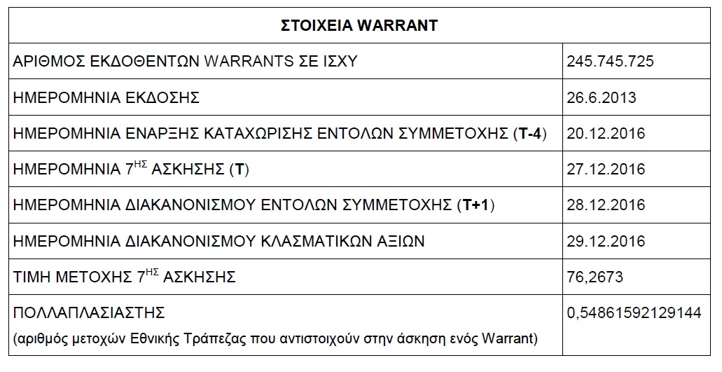 Η 27η/12 (ημέρα Τ) είναι η ημερομηνία 7ης άσκησης των Παραστατικών Τίτλων Δικαιωμάτων Κτήσης Μετοχών (Warrants), όπως ανακοίνωσε σήμερα η Εθνική Τράπεζα.