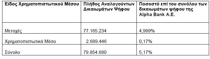Ειδικότερα, η Alpha Bank γνωστοποίησε ότι η BlackRock, Inc., κατόπιν της από 15.5.2017 σχετικής γνωστοποιήσεώς της, κατέχει έμμεσα από την 12.5.2017 δικαιώματα ψήφου τα οποία αντιστοιχούν σε ισάριθμες κοινές, ονομαστικές, μετά ψήφου, άυλες μετοχές σε ποσοστό κάτω του ορίου του 5% επί του συνόλου των δικαιωμάτων ψήφου της Τραπέζης.