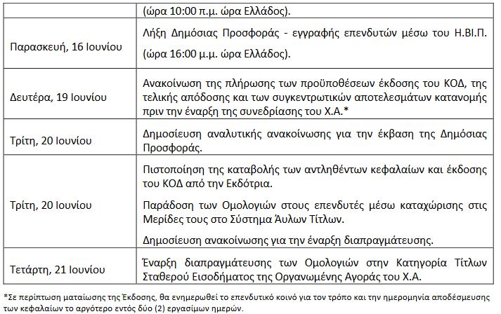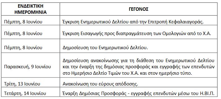 Σημειώνεται ότι το χρονοδιάγραμμα εξαρτάται από αστάθμητους παράγοντες και ενδέχεται να μεταβληθεί. Στην  περίπτωση  αυτή θα  υπάρξει  ενημέρωση  του  επενδυτικού  κοινού  με  σχετική ανακοίνωση της Εταιρείας.