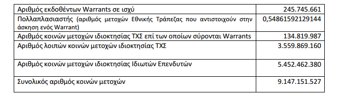 Συνεπώς, τα εκδοθέντα Warrants τα οποία παραμένουν σε ισχύ ανέρχονται σε 245.745.661, ενώ οι μετοχές της Τράπεζας επί των οποίων σύρονται και τις οποίες κατέχει το Ταμείο Χρηματοπιστωτικής