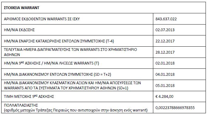 Η Τράπεζα Πειραιώς ανακοίνωσε σήμερα ότι η ημερομηνία ένατης άσκησης των Warrants είναι η 02.01.2018 (ημέρα Τ).