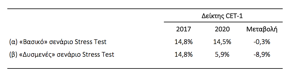 Σημειώνεται πως η άσκηση πραγματοποιήθηκε με σημείο αναφοράς τα μεγέθη του ισολογισμού της 31ης Δεκεμβρίου 2017, με προσομοίωση ακραίων καταστάσεων υπό τις παραδοχές "βασικού" και "δυσμενούς" σεναρίου. Τα αποτελέσματα υποδεικνύουν ότι για την Τράπεζα Πειραιώς στο τέλος του 2020, ο μεταβατικός Δείκτης Κεφαλαίου Κοινών Μετοχών Κατηγορίας 1 (Transitional Common Equity Tier 1 CET-1) υπό το "Βασικό" σενάριο διαμορφώνεται σε 14,5%, ενώ υπό το "Δυσμενές" σενάριο σε 5,9%.