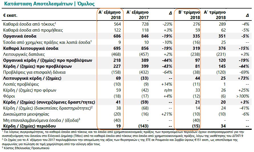 Κέρδη από συνεχιζόμενες δραστηριότητες προ φόρων ύψους €41 εκατ. το Α’ εξάμηνο του 2018 σε επίπεδο Ομίλου έναντι ζημιών €59 εκατ. το Α’ εξάμηνο του 2017