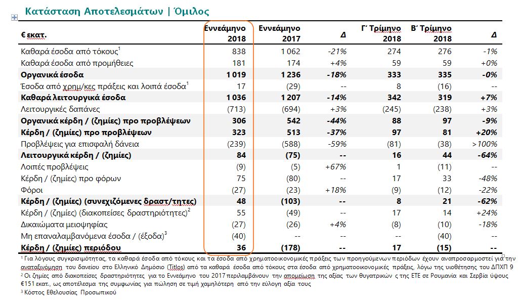 Η οργανική κερδοφορία της Τράπεζας το Εννεάμηνο του 2018 ανήλθε στα €84 εκατ., σε αντίθεση με ζημίες ύψους €75 εκατ. την αντίστοιχη περίοδο του προηγούμενου έτους. Η επίδοση αυτή αντανακλά την αποκλιμάκωση του κόστους πιστωτικού κινδύνου σε διατηρήσιμα επίπεδα της τάξεως των 110 μ.β. περίπου, μετά την επίτευξη υψηλών ποσοστών κάλυψης Μη Εξυπηρετούμενων Ανοιγμάτων. Μετά την πτώση τους κατά τα προηγούμενα δύο τρίμηνα, λόγω της απομόχλευσης του δανειακού μας χαρτοφυλακίου και της εφαρμογής των νέων λογιστικών προτύπων, τα καθαρά έσοδα από τόκους έχουν αγγίξει το χαμηλότερο σημείο τους. Ως εκ τούτου, αναμένεται σταδιακή ανάκαμψή τους, επικουρούμενη από την επιτάχυνση των εκταμιεύσεων δανείων προς επιχειρήσεις, οι οποίες υπερβαίνουν το €1 δισ. το Δ’ Τρίμηνο του 2018. Παράλληλα, η Τράπεζα έχει περιορίσει το κομμάτι των επιτοκιακών εσόδων από Μη Εξυπηρετούμενα Ανοίγματα, βελτιώνοντας έτσι την ποιότητα των καθαρών εσόδων από τόκους. Τα λειτουργικά έξοδα θα ωφεληθούν άμεσα από το τρέχον Πρόγραμμα Εθελουσίας Εξόδου Προσωπικού, με τη συμμετοχή να αναμένεται να ξεπεράσει τους 500 εργαζόμενους το 2018, καθώς και από το συνεχιζόμενο εξορθολογισμό του δικτύου καταστημάτων. Στο προσεχές διάστημα, η εφαρμογή του Σχεδίου Ανασχηματισμού της Τράπεζας, το οποίο θα ανακοινωθεί εντός του Α’ Τριμήνου του 2019, θα οδηγήσει στη σημαντική ενίσχυση της κερδοφορίας μας".