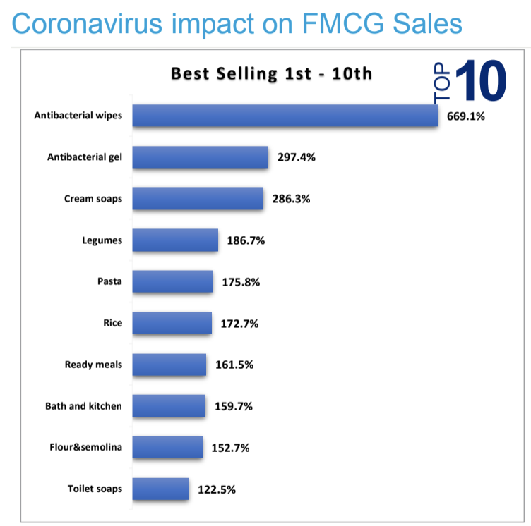 Με τις πωλήσεις των ταχυκίνητων κωδικών να έχουν καταγράψει αύξηση 41,8% και +65,9% οι 54 βασικές κατηγορίες προϊόντων (πηγή: IRI) που τζίραραν μέσα σε μια εβδομάδα 60,91 εκατ. ευρώ (βλπ. έρευνα IRI). Πρώτα σε προτιμήσεις σύμφωνα με την IRI, ήταν τα αντιβακτηριακά μαντιλάκια (+669,1% αύξηση των πωλήσεων), αντιβακτηριακά τζελ (+297,4%) και κρεμοσάπουνα (+283,4%).