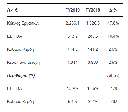 Παράλληλα, τα λειτουργικά κέρδη προ φόρων, τόκων και αποσβέσεων (EBITDA) διαμορφώθηκαν στα €313,2 εκατ. έναντι €283,6 εκατ. το 2018. (αύξηση κατά +10,4%).