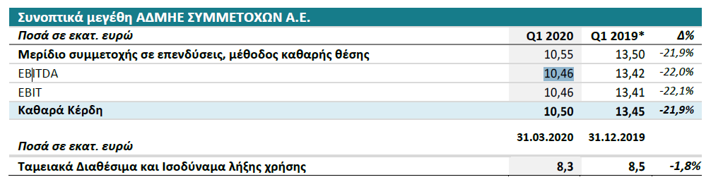 Πτώση 21,9% στα καθαρά κέρδη σημείωσε το α΄ τρίμηνο του 2020 η ΑΔΜΗΕ Συμμετοχών Α.Ε. στα 10,5 εκατ. ευρώ από 13,45 εκατ. το αντίστοιχο τρίμηνο του 2019.