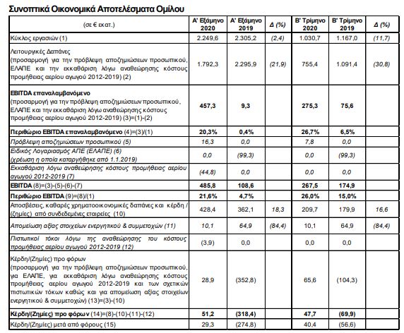 Χωρίς τα ποσά αυτά, το EBITDA σε επαναλαμβανόμενη βάση διαμορφώνεται σε € 457,3 εκατ. Αντίστοιχα και για λόγους συγκρισιμότητας, το EBITDA του α΄ εξαμήνου 2019 προσαρμόζεται σε € 9,3 εκατ. για την θετική επίπτωση από την επιστροφή € 99,3 εκατ. έναντι του πλεονάσματος του Ειδικού Λογαριασμού ΑΠΕ-ΕΛΑΠΕ. Ως αποτέλεσμα των παραπάνω, το περιθώριο EBITDAσε επαναλαμβανόμενη βάση διαμορφώθηκε σε 20,3%