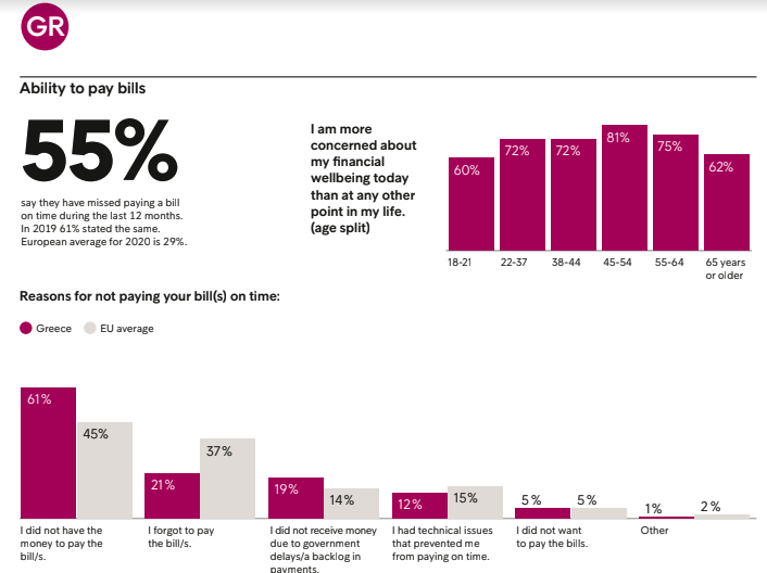 Τέλος, σχεδόν 7 στους 10 Έλληνες καταναλωτές δηλώνουν ότι παρά την πανδημία, υπήρξε αύξηση των υποχρεώσεων για πληρωμές που επέδρασε αρνητικά στον προϋπολογισμό των νοικοκυριών τους, έναντι 47% στην υπόλοιπη Ευρώπη.
