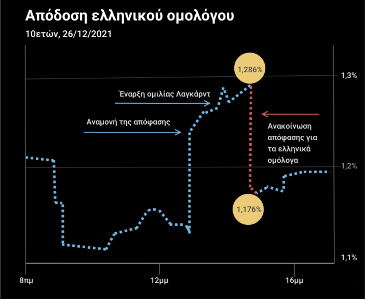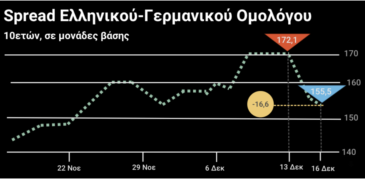 Λίγο πριν από την απόφαση, οι αποδόσεις των ελληνικών 10ετών ομολόγων σκαρφάλωσαν στο 1,286% για να πέσουν απότομα κατά 10 μονάδες βάσης, μόλις γίνεται η αναφορά στο PEPP και τα ελληνικά ομόλογα. Οι αποδόσεις των υπολοίπων ευρωπαϊκών ομολόγων δεν μειώθηκαν και, για αυτό το λόγο, μειώθηκε χθες το spread μεταξύ των ελληνικών και γερμανικών 10ετών ομολόγων κατά 16,6 μονάδες βάσης.