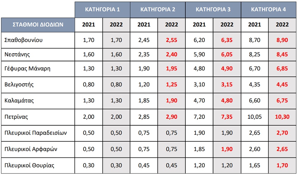 Από την προαναφερθείσα τιμαριθμική αναπροσαρμογή, και μετά από δύο συνεχή έτη μειώσεων, προκύπτουν μικρές αυξήσεις τιμών σε ορισμένους σταθμούς διοδίων και σε ορισμένες κατηγορίες οχημάτων, οι οποίες απεικονίζονται με κόκκινο χρώμα στον παρακάτω πίνακα. Οι υπόλοιπες τιμές (με μαύρο χρώμα) λόγω στρογγύλευσης δεν επηρεάζονται και παραμένουν ίδιες με αυτές του 2021: