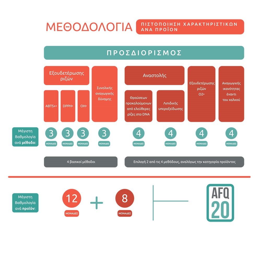 Το Εξαιρετικό Παρθένο Ελαιόλαδο MOLON LAVE, απέσπασε ιδιαίτερα υψηλή βαθμολογία σε κάθε μέθοδο που αξιολογήθηκε. Ειδικότερα, το εξεταζόμενο δείγμα επέδειξε τη μέγιστη βιοδραστικότητα σε όλα τα βιοχημικά πρωτόκολλα που υποβλήθηκε, αποσπώντας βαθμολογία 20/20.Το Εξαιρετικό Παρθένο Ελαιόλαδο MOLON LAVE προσεγγίζει υψηλότατα επίπεδα βιοδραστικότητας, σε μεγέθη που ξεπερνούν την αντιοξειδωτική ικανότητα τροφίμων χαρακτηρισμένων με την υψηλότερη αντιοξειδωτική ικανότητα παγκοσμίως όπως το ρόδι και η αρώνια. Στο διάγραμμα που ακολουθεί αποτυπώνεται η μεθοδολογία βάση της οποίας διαμορφώνεται η βαθμολογία του προτύπου πιστοποίησης AFQ.