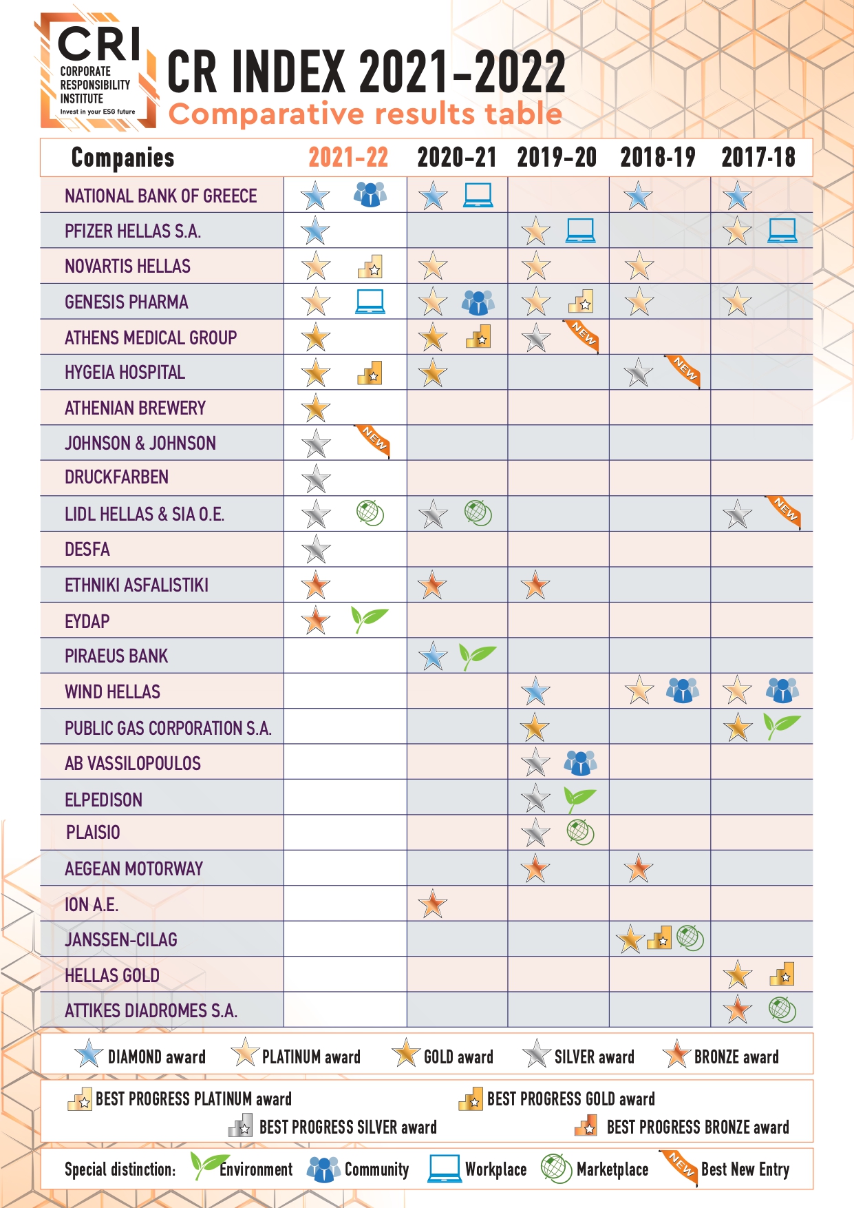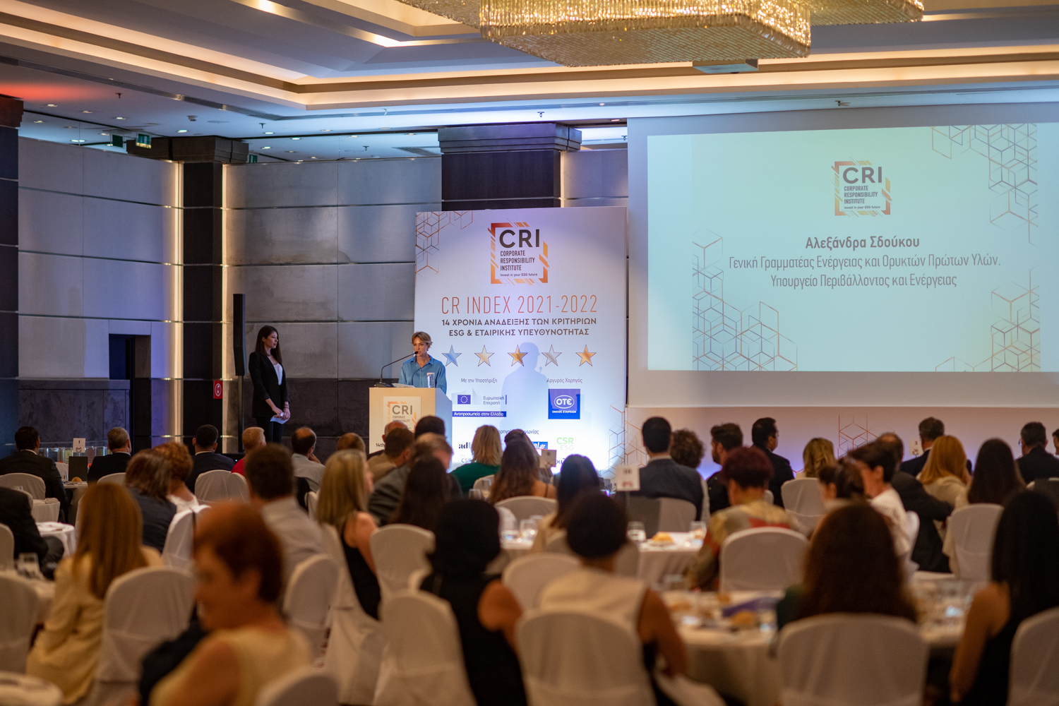 Σε επίσημη εκδήλωση που πραγματοποιήθηκε την Τρίτη 21 Ιουνίου 2022 στο Ξενοδοχείο Grand Hyatt, με την Υποστήριξη της Αντιπροσωπείας της Ευρωπαϊκής Επιτροπής στην Ελλάδα, βραβεύτηκαν οι 17 εταιρείες που παρουσίασαν εξαιρετική επίδοση το 2022, εφαρμόζοντας αποτελεσματικά πρακτικές Βιώσιμης Ανάπτυξης & κριτηρίων ESG σύμφωνα με τον Εθνικό Δείκτη CR Index και το CRI Pass.