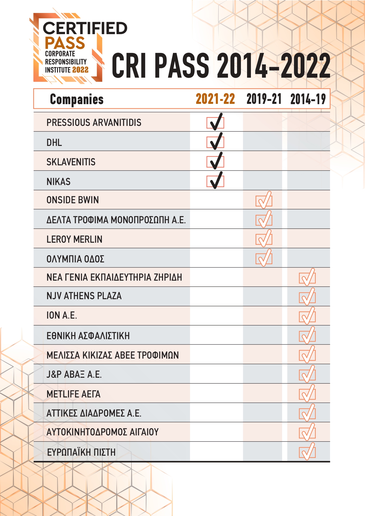 Η διάκριση CRI Pass απονεμήθηκε στην PRESSIOUS ARVANITIDIS, στην ΝΙΚΑΣ ΑΕΒΕ και στη DHL. Το CRI Pass φέτος διεξάγεται για 8η συνεχή χρονιά από το Ινστιτούτο για τις εταιρείες που κάνουν τα πρώτα βήματά τους στην Εταιρική Κοινωνική Ευθύνη.