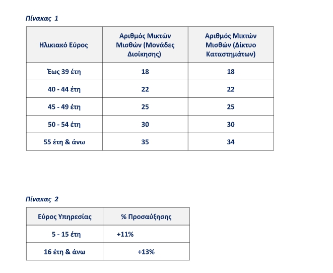 Στους Πίνακες 1 και 2, που ακολουθούν, εμφανίζεται ο αριθμός των μικτών μισθών (με βάση υπολογισμού το μικτό μηνιαίο μισθό του Ιανουαρίου 2023), που δικαιούται να λάβει ο εργαζόμενος, σύμφωνα με το εύρος ηλικίας του (με βάση υπολογισμού τα συμπληρωμένα έτη κατά την 31 η Δεκεμβρίου 2023) και το αντίστοιχο ποσοστό προσαύξησης που προκύπτει από το εύρος υπηρεσίας στον Όμιλο (με βάση υπολογισμού τα συμπληρωμένα έτη υπηρεσίας κατά την 31 η