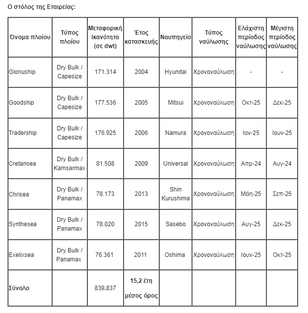 Όσον αφορά την πρόβλεψη για τις εμπορικές επιδόσεις του στόλου μας κατά το τρέχον τρίμηνο, αναμένουμε το ημερήσιο TCE να είναι περίπου 17.500 δολάρια, λαμβάνοντας υπόψη τις τρέχουσες τιμές των FFA. Η πρόβλεψη αυτή συμπεριλαμβάνει σταθερά ναύλα για τέσσερα από τα πλοία μας που συμφωνήθηκαν κατά το προηγούμενο τρίμηνο. Αναφορικά με τον στόλο μας, κατά το δεύτερο τρίμηνο του 2024, ο προγραμματισμένος δεξαμενισμός του M/V Goodship ολοκληρώθηκε και εγκαταστάθηκαν επιτυχώς συσκευές εξοικονόμησης ενέργειας που θα μας επιτρέψουν να επιδιώξουμε υψηλότερο ημερήσιο ναύλο. Είμαστε ιδιαίτερα ικανοποιημένοι με την επιτυχή και έγκαιρη ολοκλήρωση ενός εκτενούς προγράμματος αναβάθμισης και επισκευών που περιλάμβανε τον δεξαμενισμό τεσσάρων πλοίων (3 Capesize και 1 Kamsarmax) του στόλου μας. Επιπλέον, το M/V Gloriuship έχει ναυλωθεί για ένα ταξίδι 70-80 ημερών περίπου, στα 22.500 δολάρια την ημέρα.