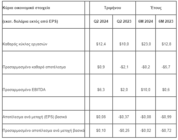 Για το πρώτο εξάμηνο του 2024, η Εταιρεία πραγματοποίησε καθαρά έσοδα ύψους 23,0 εκατ. δολαρίων σε σύγκριση με τα 12,8 εκατ. δολάρια την ίδια περίοδο του 2023. Οι καθαρές ζημιές και οι προσαρμοσμένες καθαρές ζημιές για το πρώτο εξάμηνο του 2024 ήταν 0,7 εκατ. δολάρια και 0,2 εκατ. δολάρια αντίστοιχα, σε σύγκριση με τις καθαρές ζημίες ύψους 7,9 εκατ. δολαρίων και τις προσαρμοσμένες καθαρές ζημιές ύψους 5,7 εκατ. δολαρίων την αντίστοιχη περίοδο του 2023. Το προσαρμοσμένο EBITDA για το πρώτο εξάμηνο του 2024 ανήλθε σε 10,0 εκατ. δολάρια σε σύγκριση με τα 0,6 εκατ. δολάρια την αντίστοιχη περίοδο του 2023. Το TCE του στόλου για το πρώτο εξάμηνο του 2024 ήταν 16.187 δολάρια ανά ημέρα.