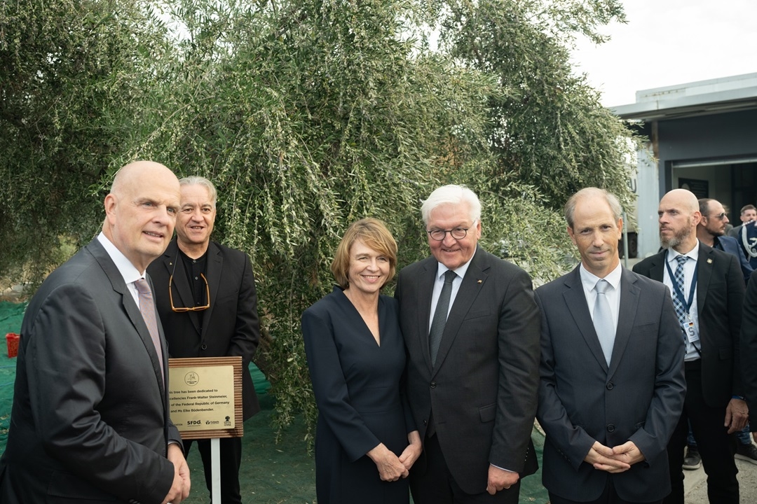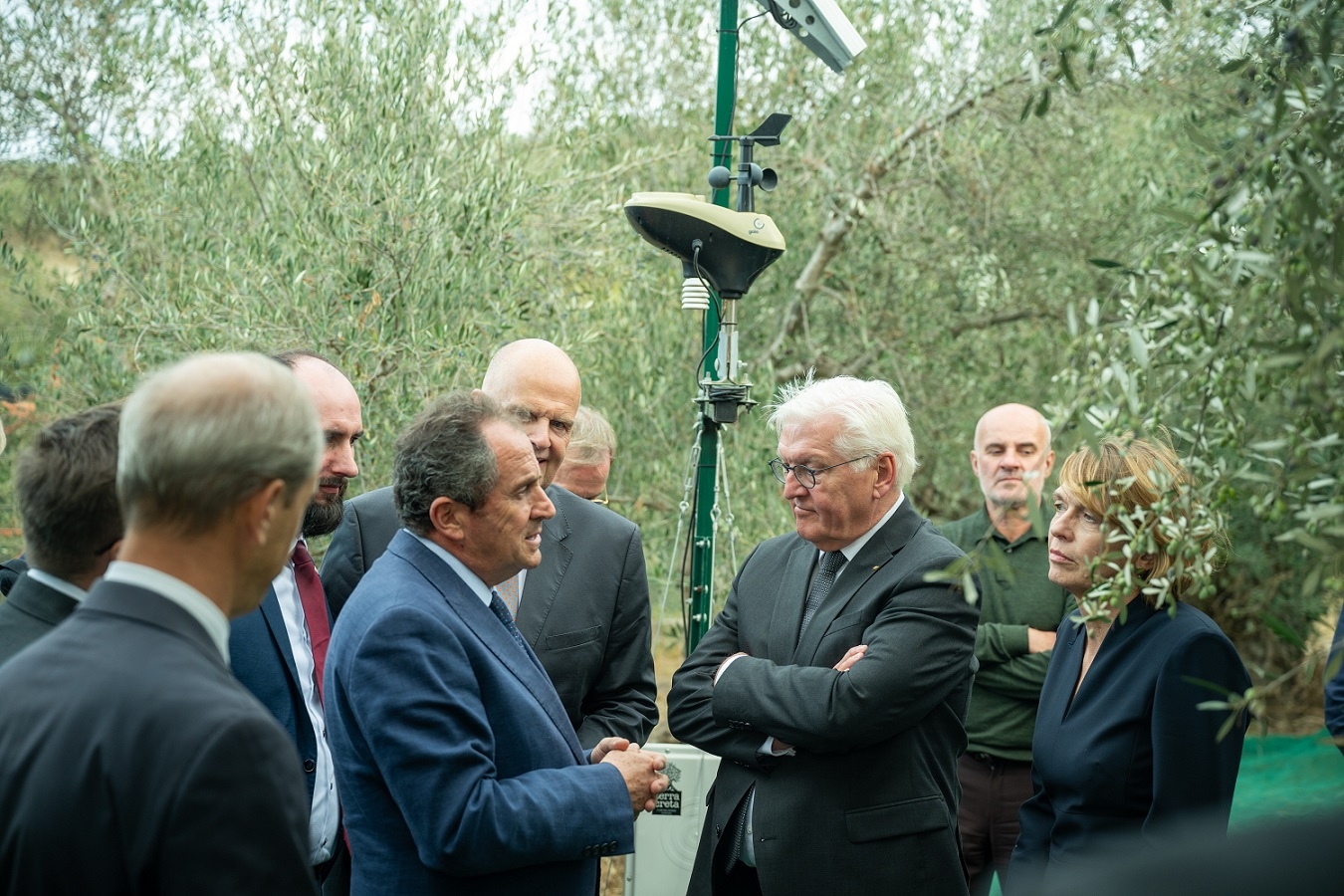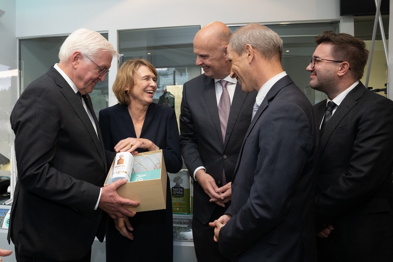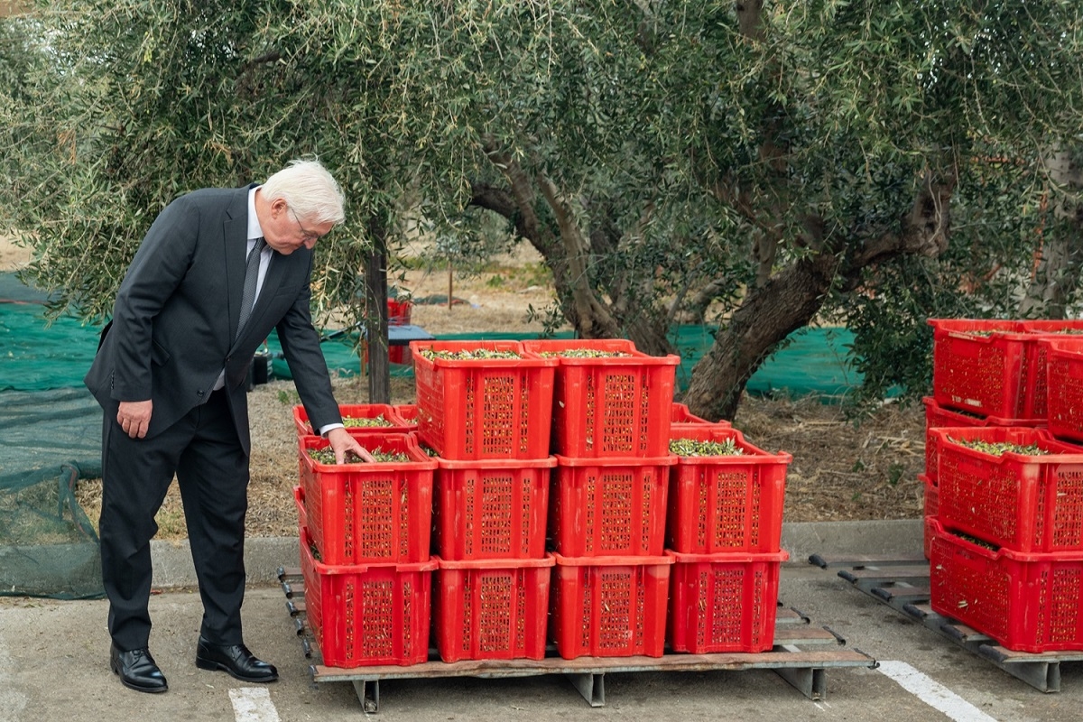 Ο Φώτης Σουσαλής, Olive Oil Plant & Sourcing Director της Melissa-Kikizas, υποδέχθηκε τον Γερμανό Πρόεδρο και τον ξενάγησε στις εγκαταστάσεις του υπερσύγχρονου ελαιοποιείου της Terra Creta, όπου περιηγήθηκαν στη γραμμή παραγωγής ελαιολάδου. Στη συνέχεια, είχαν την ευκαιρία να συνομιλήσουν με τους παραγωγούς της Ακαδημίας Ελιάς Terra Creta, μια πρωτοβουλία της εταιρείας που δημιουργήθηκε με σκοπό την αναβάθμιση της παραγωγής ελιάς και ελαιόλαδου, εκπαιδεύοντας τους ελαιοπαραγωγούς του τόπου στις πιο σύγχρονες πρακτικές με τη χρήση εργαλείων Ευφυούς Γεωργίας. Συνάμα, συζήτησαν σχετικά με την εφαρμογή των αρχών της αναγεννητικής γεωργίας στην παραγωγή ελαιολάδου, και μυήθηκαν στην ελαιογευσία του πολυβραβευμένου εξαιρετικού παρθένου ελαιολάδου Terra Creta.
