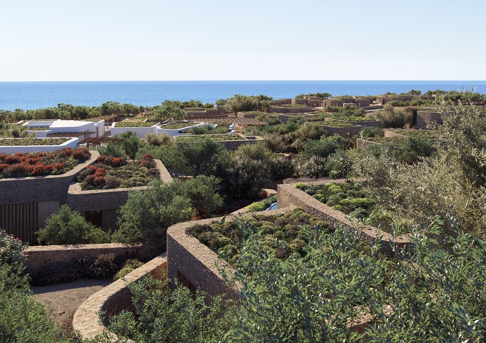Ακολουθώντας τη γεωμετρική τυχαιότητα της γενικής διάταξης, όπως σχηματοποιείται στο ίχνος των γλυπτικών, λίθινων τοίχων κατά μήκος του δικτύου πεζοδρόμων, τα κτίρια καταλυμάτων από πέτρα και κάποια από σοβά ενσωματώνονται ισορροπημένα στους εδαφικούς κυματισμούς.  Οι προστατευμένες, μεσογειακές αυλές τους ανοίγονται προς τη θέα αποτελώντας συνέχεια των εσωτερικών χώρων, το "μέσα" με το "έξω" ενοποιείται.  Πέργκολες και στοιχεία σκιασμού από ακατέργαστο ξύλο και πλεκτές, ψάθινες φολίδες  συμπληρώνουν τους κτιριακούς όγκους παρέχοντας μία φυσική αίσθηση.  Η λεπτότεχνη κατασκευή τους παραπέμπει σε παραδοσιακές τεχνικές.