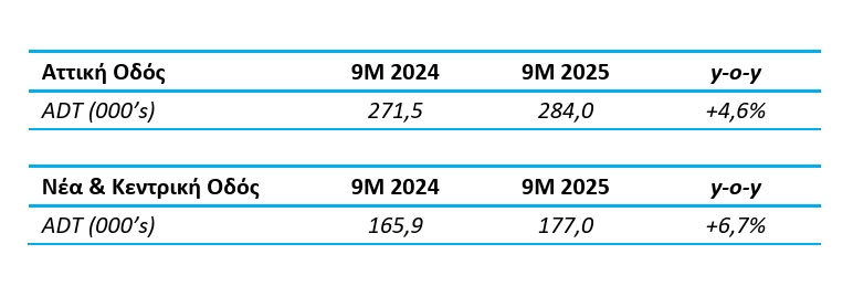 Όσον αφορά τους αυτοκινητόδρομους της Νέας και της Κεντρικής Οδού, για τους πρώτους εννέα μήνες του 2025, η μέση ημερήσια κίνηση παρουσίασε αύξηση κατά 6,7% σε σχέση με την αντίστοιχη περίοδο της προηγούμενης χρονιάς. Ο συνολικός αριθμός διελεύσεων ανέρχεται σε 48,3 εκατ. και μέσος ημερήσιος αριθμός διελεύσεων (ADT) διαμορφώνεται σε 176.966.