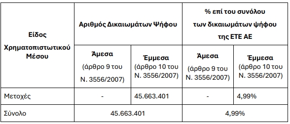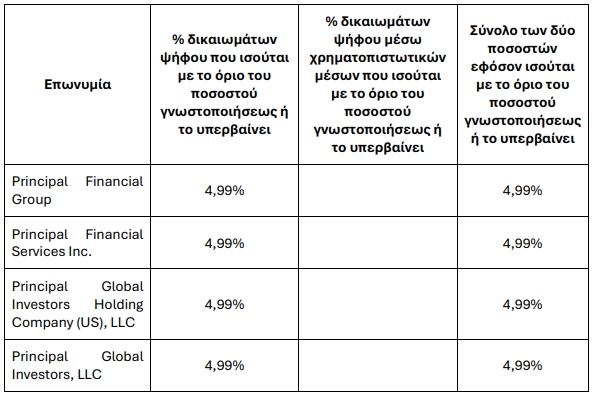 Σε συνέχεια σχετικής γνωστοποίησης σημαντικών αλλαγών στα δικαιώματα ψήφου της Τράπεζας από την "Principal Global Investors, LLC” σύμφωνα με τον Ν. 3556/2007, καθώς και της από 16.10.2025 γνωστοποίησης που έλαβε η Τράπεζα από την "Principal Financial Group”, υπό την ιδιότητά της ως τελική μητρική εταιρεία της "Principal Global Investors, LLC”, η Τράπεζα γνωστοποιεί με την παρούσα, ότι το συνολικό ποσοστό δικαιωμάτων ψήφου τα οποία αντιστοιχούν σε ισάριθμες κοινές, ονομαστικές, μετά ψήφου, άυλες μετοχές που κατέχει έμμεσα η "Principal Financial Group”, από την ημερομηνία που αυτά περιήλθαν στην κατοχή της "Principal Global Investors, LLC”, κατήλθε στις 13.10.2025 του ελάχιστου ορίου του 5% επί του συνόλου των δικαιωμάτων ψήφου της Τράπεζας.