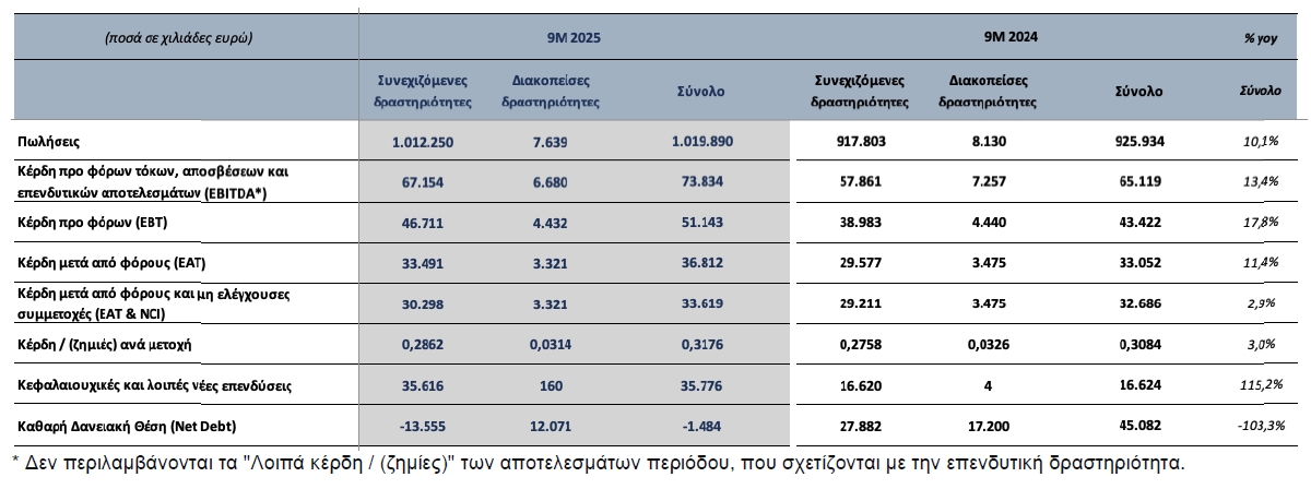 Σε σύγκριση με το αντίστοιχο εννεάμηνο του 2024, οι πωλήσεις σημείωσαν αύξηση 10,1%, η λειτουργική κερδοφορία (EBITDA) 13,4%, τα κέρδη προ φόρων (ΕΒΤ) 17,8%, τα καθαρά κέρδη μετά από φόρους (ΕAΤ) 11,4%, όπως αναφέρει η εισηγμένη σε σχετική ανακοίνωση.