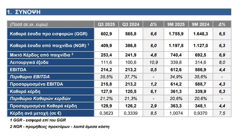 Τα καθαρά έσοδα προ εισφορών (GGR) εννεαμήνου 2025 διαμορφώθηκαν στα €1.755,9εκ. έναντι €1.648,3εκ. το εννεάμηνο 2024, αυξημένα κατά 6,5% σε ετήσια βάση, ως αποτέλεσμα της ισχυρής ανάπτυξης στην επίγεια δραστηριότητα (retail) και στο online. Τα GGR του γ’ τριμήνου 2025 ανήλθαν σε €602,9εκ., υψηλότερα κατά 6,6% σε ετήσια βάση, κυρίως λόγω της δυναμικής επίδοσης των αριθμολαχείων.