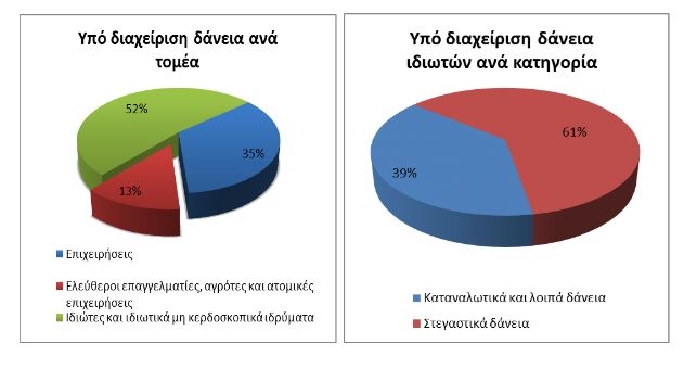 Η ονομαστική αξία των υπό διαχείριση δανείων προς ιδιώτες και ιδιωτικά μη κερδοσκοπικά ιδρύματα μειώθηκε κατά 610 εκατ. ευρώ έναντι του προηγούμενου τριμήνου και διαμορφώθηκε σε 41.365 εκατ. ευρώ στο τέλος του γ΄ τριμήνου του 2025. Αναλυτικότερα, τα υπό διαχείριση καταναλωτικά δάνεια παρουσίασαν μείωση κατά 492 εκατ. ευρώ και διαμορφώθηκαν σε 15.762 εκατ. ευρώ. Τα υπό διαχείριση στεγαστικά δάνεια παρουσίασαν μείωση κατά 116 εκατ. ευρώ και διαμορφώθηκαν σε 25.254 εκατ. ευρώ.