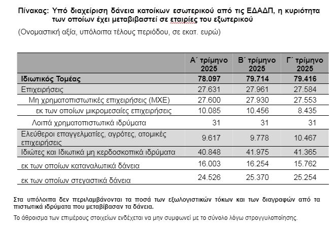 Η ονομαστική αξία των υπό διαχείριση επιχειρηματικών δανείων μειώθηκε σε 27.584 εκατ. ευρώ στο τέλος του γ΄ τριμήνου του 2025, από 27.961 εκατ. ευρώ στο τέλος του προηγούμενου τριμήνου.