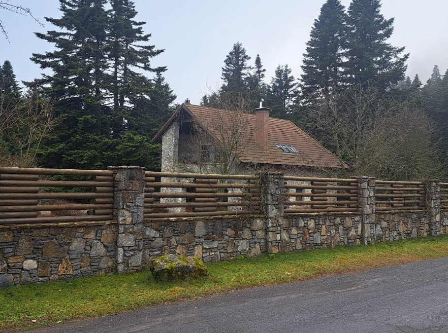 Κατά την αυτοψία διαπιστώθηκε πως εντός του αγροτεμαχίου έχουν ανεγερθεί δύο κτίσματα ήτοι ένα ισόγειο κτίσμα και ένα διώροφο. Λόγω του ότι στα προσκομιζόμενα έγγραφα δεν αναφέρονται οι επιφάνειες των κτισμάτων έγινε επιμέτρηση στην πλατφόρμα Google Earth, με το ισόγειο κτίσμα να έχει επιφάνεια 80 τ.μ. και τη διώροφη οικία 105 τ.μ. Τα κτίσματα φαίνεται να έχουν χρήση κατοικίας και έχουν φέροντα οργανισμό και τοιχοποιίες από λιθοδομή, ξύλινα εξωτερικά κουφώματα και επικάλυψη ξύλινης κεραμοσκεπής. Ο ακάλυπτος χώρος του αγροτεμαχίου είναι εν μέρει στρωμένος με πέτρα, εν μέρει διαμορφωμένος με παρτέρια και δεντροφυτεύσεις και έχει κατασκευαστεί σε αυτόν τεχνητή λίμνη μικρού βάθους.