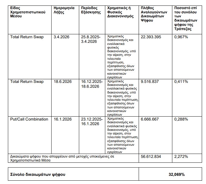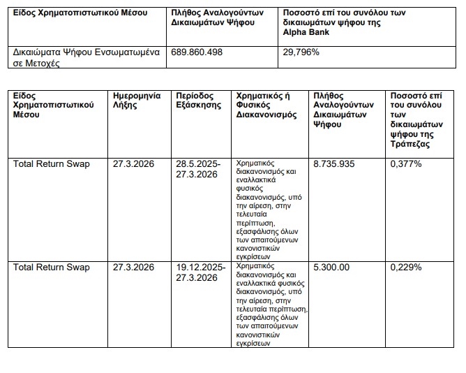 Στην εξάσκηση των χρηματοοικονομικών προϊόντων, τα οποία οδήγησαν στην άμεση απόκτηση 689.860.498 κοινών μετοχών με δικαίωμα ψήφου, που αντιστοιχούν σε ποσοστό 29,796 % επί του συνόλου δικαιωμάτων της Alpha Bank προχώρησε η UniCredit.