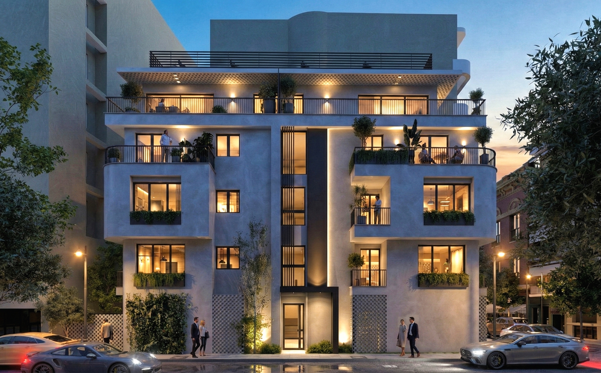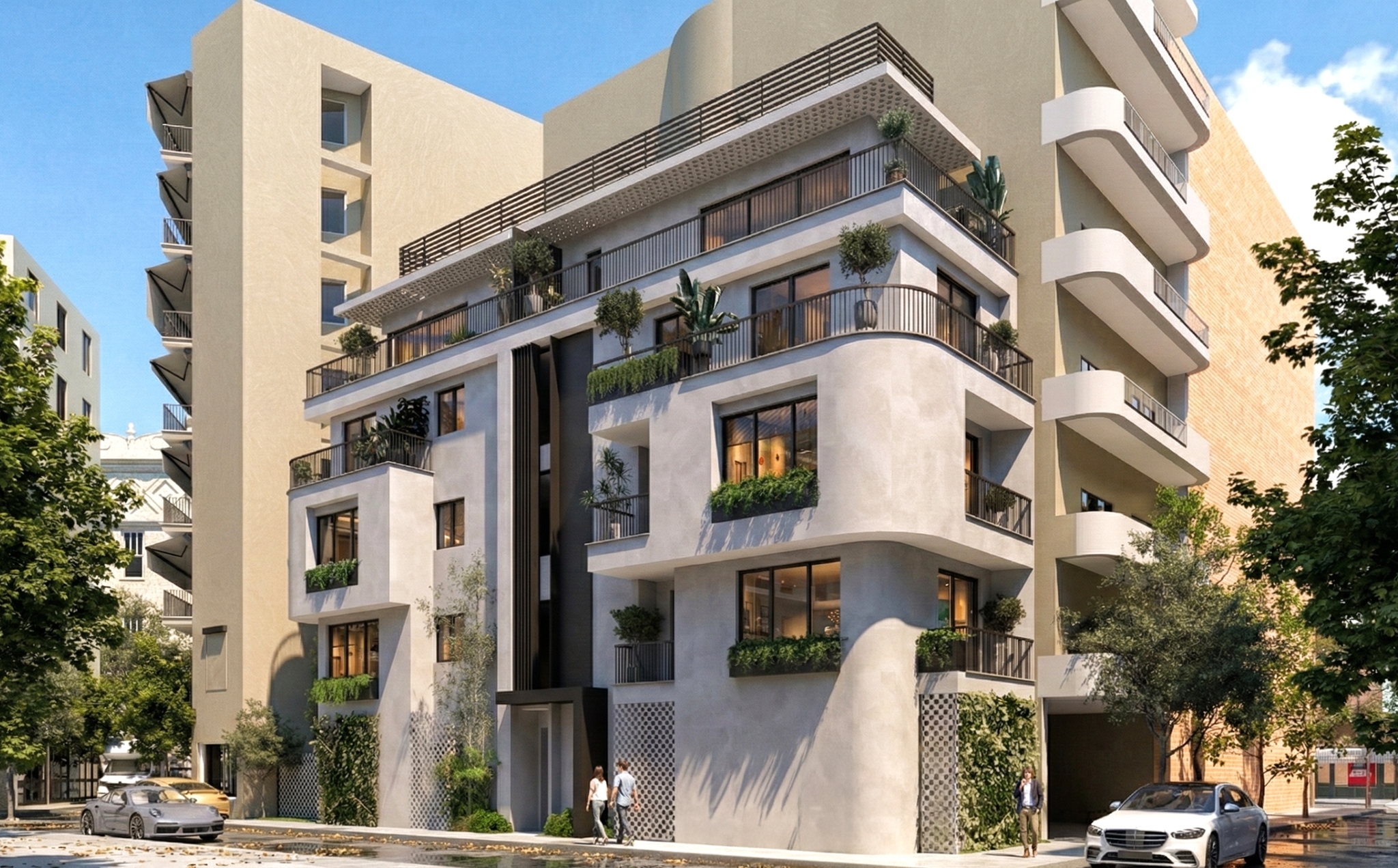 Όπως η ίδια εξηγεί, ο σχεδιασμός αξιοποιεί πλήρως τη γεωμετρία του οικοπέδου. Τα ελαφρώς καμπύλα τμήματα προσδίδουν δυναμισμό και συμβάλλουν στην αρμονική ογκοπλασία, ενώ η κατακόρυφη κυκλοφορία, τοποθετημένη στο κέντρο, διαιρεί τον όγκο σε δύο μέρη και διαχωρίζει λειτουργικά τους χώρους. Με τον τρόπο αυτό εξασφαλίζονται γωνιακά διαμερίσματα με άπλετο φυσικό φωτισμό, ιδιωτικότητα και λειτουργικότητα, ακόμη και σε περιορισμένες επιφάνειες. Παράλληλα, ο συνδυασμός γήινων αποχρώσεων, μεταλλικών στοιχείων, κλωστρών και φυτεύσεων στις όψεις δημιουργεί ένα κτήριο που εντάσσεται αρμονικά στην περιοχή, χωρίς ωστόσο να περνά απαρατήρητο.
