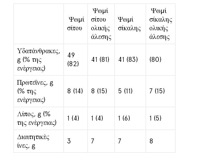 Διατροφική αξία του ψωμιού ανά 100 γρ.