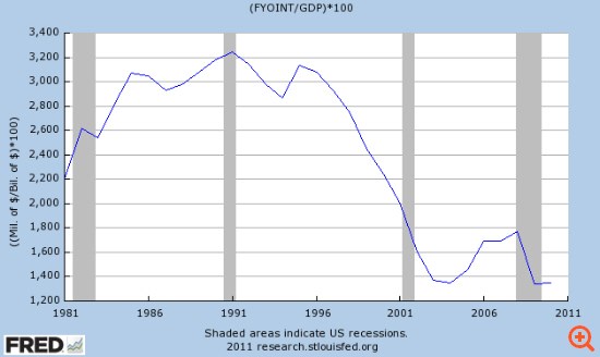 Όπως δείχνει καθαρά το διάγραμμα, το συνολικό κόστος για τόκους τρέχει με περίπου 230 δισ. δολάρια ετησίως. Τώρα ας δούμε και το επόμενο διάγραμμα, που απεικονίζει το κόστος εξυπηρέτησης του χρέους σε σχέση με το Αμερικανικό ΑΕΠ.