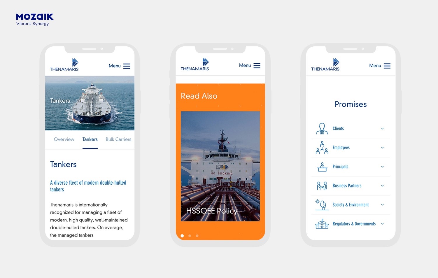 Η ιστοσελίδα, όμως, της Thenamaris δεν ανταποκρινόταν πλέον στον ηγετικό χαρακτήρα της εταιρίας και έτσι η Thenamaris ανέθεσε στη Mozaik τη δημιουργίαμιακαινούργιαςπρωτοποριακήςιστοσελίδας που να ανταποκρίνεται στην εικόνα του σήμερα. Μια ιστοσελίδα που να αντικατοπτρίζει την ισχυρή και σταθερή θέση της επιχείρησης στο χώρο της ναυτιλίας καθώς επίσης και να παρουσιάζει την αποστολή, το όραμα και τις αξίες της.