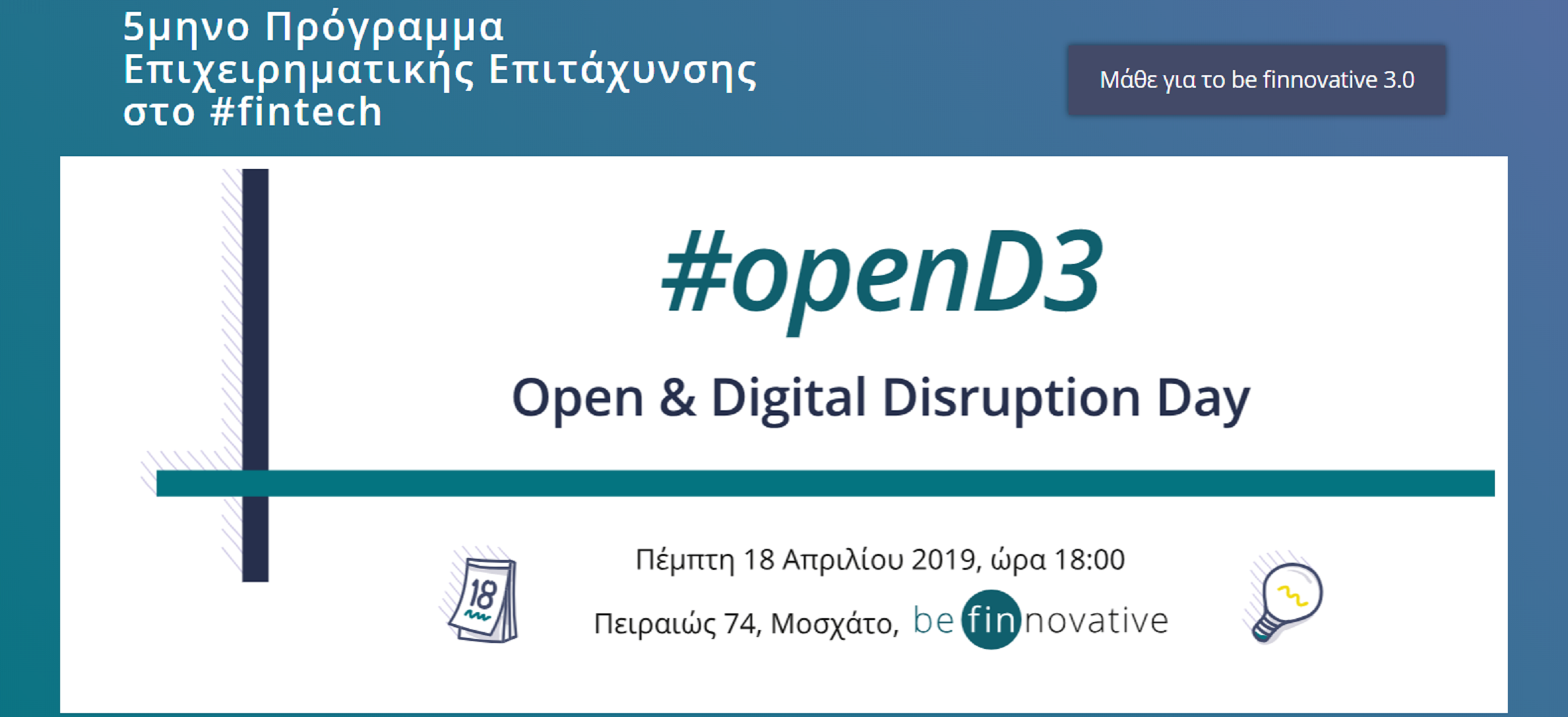 Την Πέμπτη 18 Απριλίου 2019 και ώρα 18:00 θα πραγματοποιηθεί η ανοικτή εκδήλωση "Open & Digital Disruption Day - #openD3” στους χώρους του be finnovative, στο κτήριο της Εθνικής Τράπεζας Πειραιώς 74 στο Μοσχάτο.