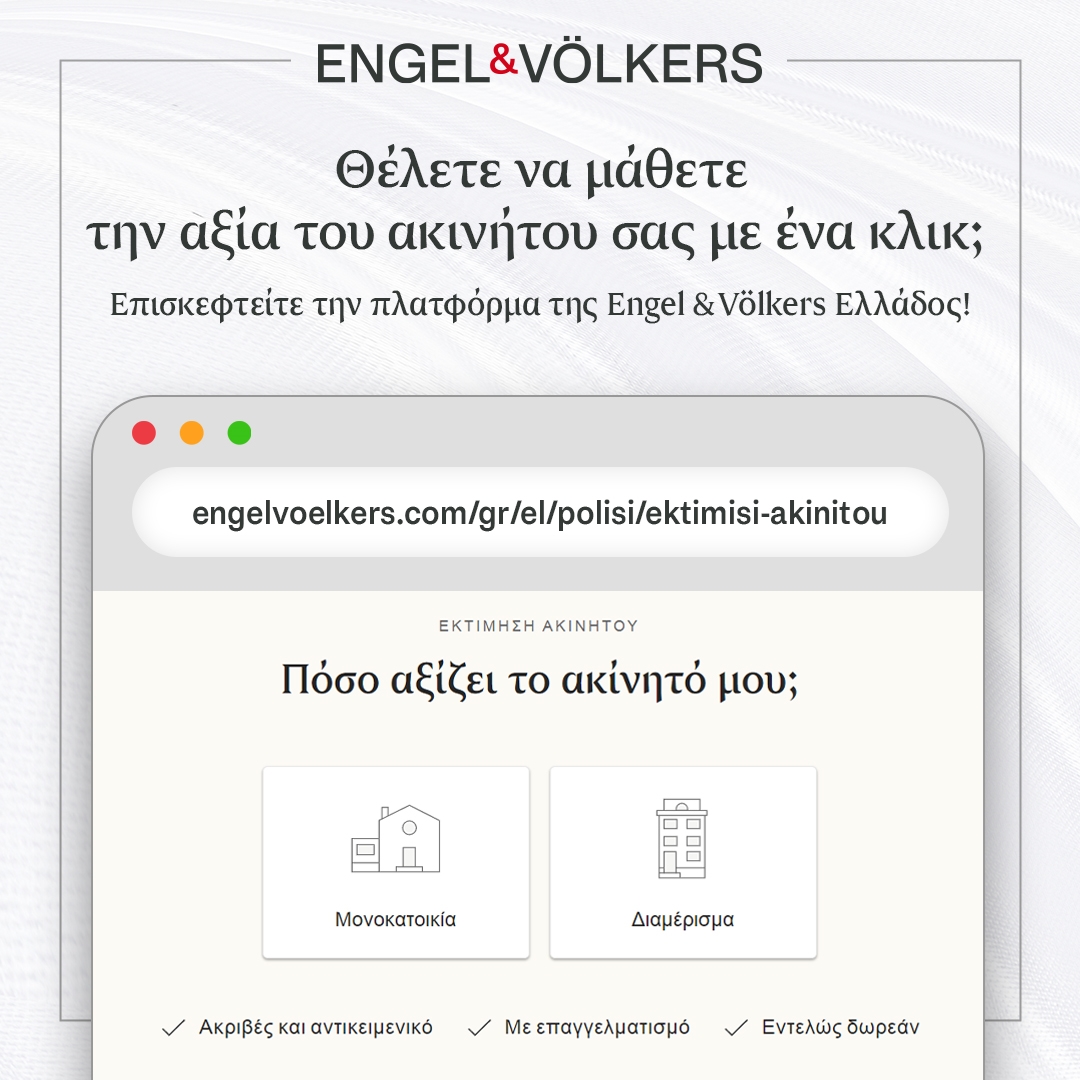 Σας καλούμε να ανακαλύψετε τη νέα υπηρεσία εκτίμησης ακινήτων της Engel & Völkers Ελλάδος: https://www.engelvoelkers.com/gr/el/polisi/ektimisi-akinitou