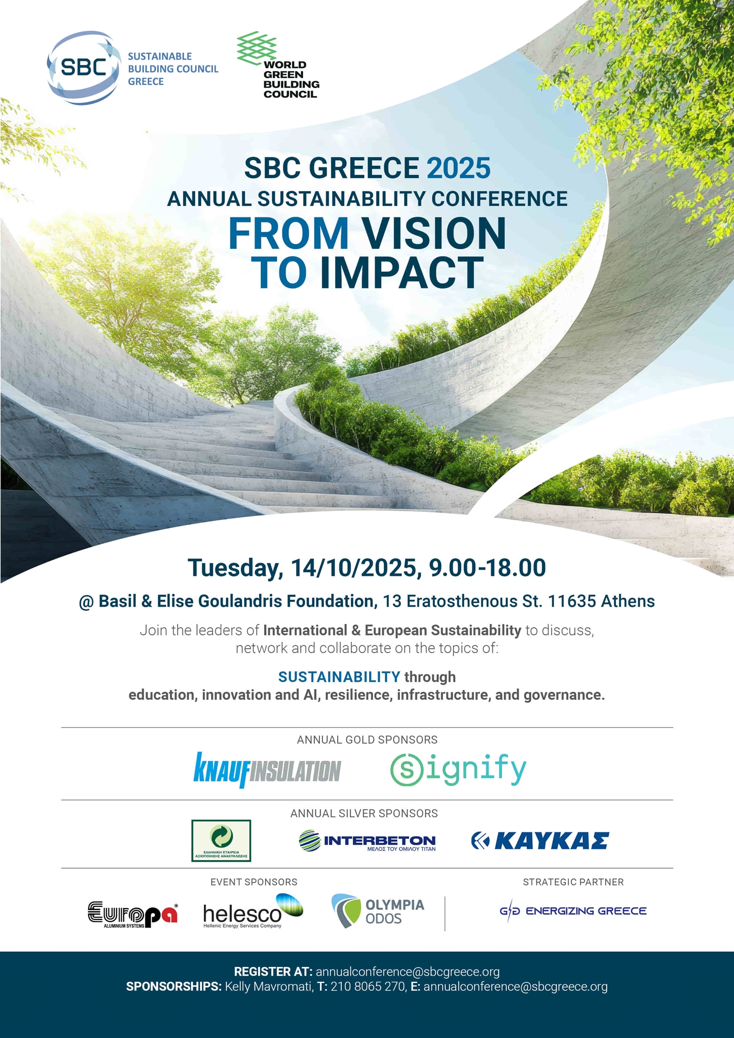 Το Συμβούλιο Αειφόρων Κτιρίων Ελλάδας (SBC Greece), ως επίσημο μέλος του World Green Building Council (World GBC) στην Ελλάδα, ανακοινώνει την διοργάνωση του Ετήσιου Συνεδρίου Αειφορίας 2025 με τίτλο "From Vision to Impact", που τελείται υπό την αιγίδα του Υπουργείου Ενέργειας και Περιβάλλοντος και θα πραγματοποιηθεί την Τρίτη, 14 Οκτωβρίου 2025, 09:00-18:00, στο Ίδρυμα Βασίλη και Ελίζας Γουλανδρή, Ερατοσθένους 13, Αθήνα.