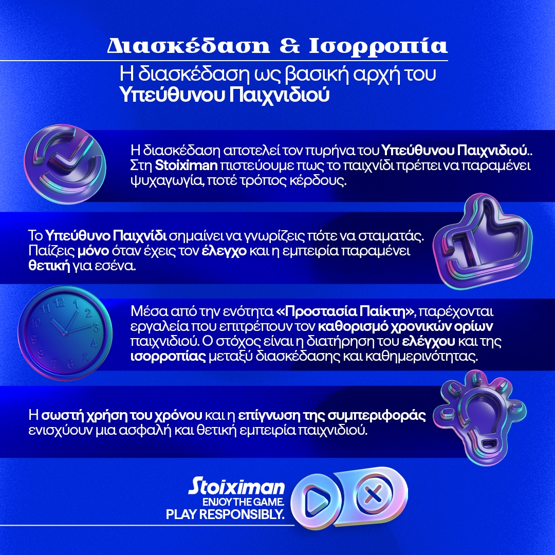 Έτσι, το Responsible Gaming για τη Stoiximan δεν περιορίζεται σε ένα υποχρεωτικό disclaimer στο κάτω μέρος της οθόνης. Συνδέεται με μια σύγχρονη αντίληψη για την ψηφιακή ζωή: ισορροπημένη χρήση, προσωπικά όρια, γνώση του πώς λειτουργεί ο άνθρωπος μπροστά στο παιχνίδι. Με άλλα λόγια, μια υπεύθυνη ψυχαγωγία που ξεπερνά το ίδιο το παιχνίδι και αγγίζει συνολικά τον τρόπο που σχετιζόμαστε με την τεχνολογία.