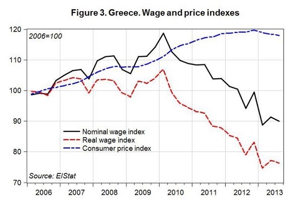 Όπως βλέπουμε και στο γράφημα 1, οι τρομακτικές μειώσεις των μισθών σε συνδυασμό με την άγρια φορολογία, έχει διατηρήσει τις τιμές στα ύψη, παρουσιάζοντας έναν πληθωρισμό της τάξης του 35%. Η όποια κερδοφορία των επιχειρήσεων, δεν επιστρέφει στην οικονομία με ανάλογη μείωση τιμών, καθώς οι επιχειρήσεις γδάρθηκαν απο την εφορία.