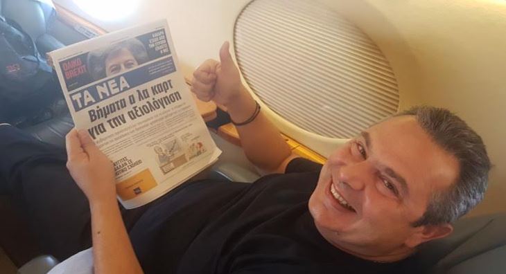 Ο κ. Καμμένος, ο υπουργός Εθνικής Άμυνας και κατ’ ουσία ο σκιώδης πρωθυπουργός της εθνικολαϊκιστικής κυβέρνησης ΣΥΡΙΖΑΝΕΛ, φωτογραφίζεται μέσα στο Πρωθυπουργικό σκάφος, κρατώντας την εφημερίδα ΤΑ ΝΕΑ, φύλλο 18/1, δηλαδή το φύλλο της επομένης της συμφωνίας "άλωσης" του ΔΟΛ από την κυβέρνηση, με την "εισβολή" Μουλόπουλου. Ενώ με το δεξί του χέρι, κάνει το σήμα του "thumb up", που σημαίνει κάτι σαν "αποστολή εξετελέσθη". Να υποθέσω ότι την προηγούμενη μέρα στα επιτελεία τους συζητώντας για το ΔΟΛ είχαν δώσει το σήμα "thumb down" που επί ρωμαϊκής αυτοκρατορίας σήμαινε "θάνατος στον μονομάχο".