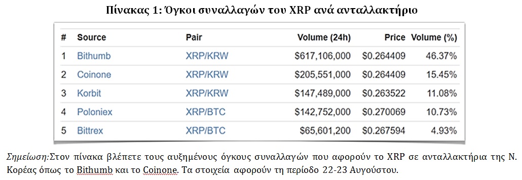 Η ημερήσια ποσοστιαία μεταβολή του ripple κατά την περίοδο 22–23 Αυγούστου έφτασε το 60%, εν μέσω μίας περιόδου αυξημένου όγκου συναλλαγών στην παγκόσμια αγορά κρυπτονομισμάτων. Ωστόσο, ενώ η τιμή του XRP παραμένει κάτω από το ιστορικό υψηλό του Μαΐου όταν και πλησίασε τα 0,40$, ο όγκος συναλλαγών του νομίσματος στις 22-23 Αυγούστου ξεπέρασε το 1 δισ. δολ. (ο υψηλότερος που έχει καταγραφεί για το νόμισμα) πυροδοτούμενος από την αναταραχή στην ευρύτερη περιοχή της Κορεατικής χερσονήσου και ως εκ τούτου η αύξηση αυτή προήλθε από αυξημένους όγκους συναλλαγών στα ανταλλακτήρια της Νοτίου Κορέας και της Ασίας (Πίνακας 1).