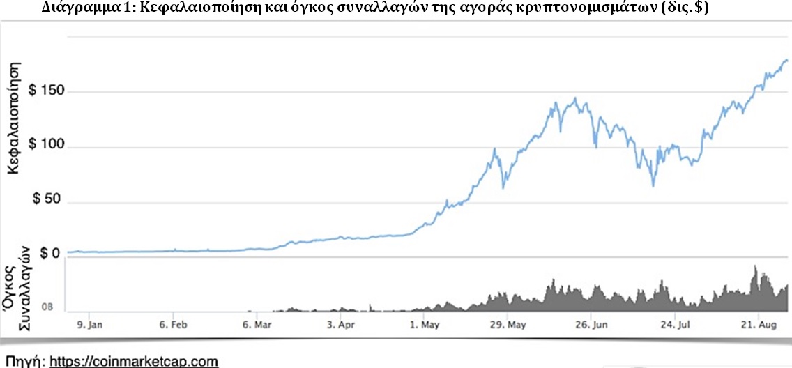 Θα περίμενε κανείς πως η λογική αντίδραση του μέσου επενδυτή, εντός του παραδοσιακού χρηματοπιστωτικού συστήματος, στο άκουσμα του bitcoin να φανερώνει από τη μία πλευρά ικανοποίηση για τη δυναμική του κρυπτονομίσματος ως μία πραγματικά αξιόλογη επενδυτική ευκαιρία με εξαιρετικές αποδόσεις, αλλά και την επιφυλακτικότητά του για τη μελλοντική του εξέλιξη, παρά το γεγονός ότι τυχόν αδυναμίες που προέκυψαν ανά διαστήματα ξεπεράστηκαν επιτυχώς. Ωστόσο, είναι άξιο αναφορά το γεγονός ότι από την αρχή του έτους και έπειτα παρατηρείται και μία έντονη διαφοροποίηση στις αντιδράσεις ανάμεσα στους επενδυτές της Δύσης και σε αυτούς της Ασίας, κυρίως της Ιαπωνίας, της Νοτίου Κορέας και της Κίνας, με τους τελευταίους να δείχνουν αρκετά πιο δεκτικοί στις καινοτομίες και στις προκλήσεις που θέτουν τα κρυπτονομίσματα. Σύμφωνα με κάποιους αναλυτές, η διαφοροποίηση αυτή ίσως να οφείλεται στην ίδια την αποκεντροποιημένη φύση του bitcoin, το ελκυστικότερο από τα χαρακτηριστικά του για μία μεγάλη μερίδα επενδυτών, στη διαφορετική κουλτούρα και στις διαφορετικές προτιμήσεις των επενδυτών ανά γεωγραφική περιοχή, ή ακόμα και στο γεγονός πως η Ευρώπη και οι ΗΠΑ ήταν πιο "εκτεθειμένες" σε ατυχή συμβάντα που μπορεί να συνέδεσαν το bitcoin με παράνομες δραστηριότητες ή περιπτώσεις hacking. Τον τελευταίο μήνα, οι αγορές της Ασίας έπειτα από την κλιμάκωση στη σχέση των ΗΠΑ με τη Βόρεια Κορέα, ώθησαν όχι μόνο το Bitcoin αλλά και κάποια από τα μεγαλύτερα σε όρους κεφαλαιοποίησης κρυπτονομίσματα, όπως το Ethereum, σε αυξημένους όγκους συναλλαγών και σε κάποιες περιπτώσεις σε ιστορικά υψηλά των τιμών τους. Όπως έχει αποδειχθεί άλλωστε στο παρελθόν, η αγορά των κρυπτονομισμάτων λειτουργεί ως ασφαλές επενδυτικό "καταφύγιο" σε περιπτώσεις διεθνών κρίσεων, κάτι που συνέβη τόσο κατά τη περίοδο του Brexit όσο και των πιο πρόσφατων εκλογών στις ΗΠΑ. Είναι χαρακτηριστικό ότι στις 16 Ιουλίου η συνολική κεφαλαιοποίηση της αγοράς βρισκόταν κοντά στα $68 δισ, για να προστεθούν σε αυτά κάτι λιγότερο από $100 δισ., ώστε η συνολική κεφαλαιοποίηση να ξεπεράσει τα $160 δισ. κατά την τελευταία εβδομάδα του Αυγούστου (Διάγραμμα 1).