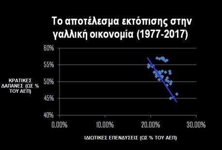 Οι πολύ υψηλές κρατικές δαπάνες δημιουργούν το φαινόμενο της εκτόπισης του ιδιωτικού τομέα. Όταν αυξάνονται οι δαπάνες του κράτους ως ποσοστό του παραγόμενου εισοδήματος οι επιχειρηματίες προσδοκούν ότι αυτές θα χρηματοδοτηθούν με την επιβολή φόρων και αποθαρρύνονται στην πραγματοποίηση επενδύσεων. Η μείωση των ιδιωτικών επενδύσεων ως αποτέλεσμα της αύξησης των κρατικών δαπανών λέγεται "αποτέλεσμα εκτόπισης” στη μακροοικονομία και ειδικά στη Γαλλία φαίνεται στο παρακάτω διάγραμμα: