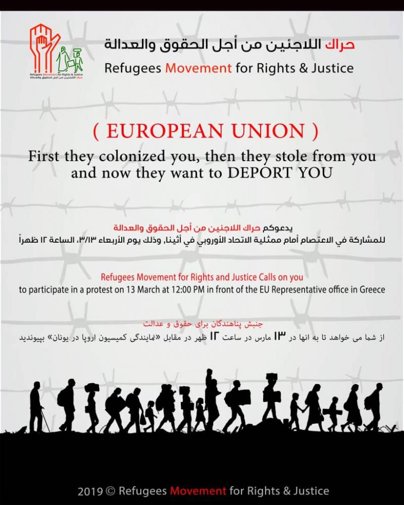 Θαυμάστε θράσος: "Πρόκειται για μια άδικη απόφαση της Ε.Ε. να διώξει τους πρόσφυγες από την κατοικία τους και να σταματήσει την οικονομική βοήθεια [...] Έχουμε ήδη θυσιάσει αρκετά! Δε θα φύγουμε από την κατοικία μας. Δε θα χάσουμε την αξιοπρέπειά μας. Δε θα χάσουμε τα δικαιώματά μας"