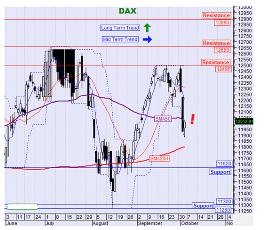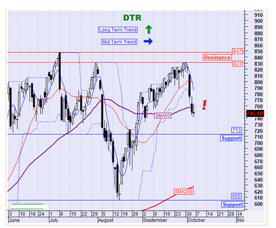 Λίγο διαφορετική είναι η εικόνα του ΔΤΡ. Ο δείκτης πρόσφατα (3/10) διέσπασε καθοδικά τον απλό κινητό μέσο των 50ημερών χωρίς όμως ακόμη να είναι επιβεβαιωμένη η διάσπαση. Μπορεί λοιπόν στη συνέχεια να ακολουθήσει μια ανοδική αντίδραση ως προσπάθεια ανάκτησης του 50άρη ή άμεση καθοδική συνέχεια λαμβάνοντας ως επιβεβαίωση της διάσπασης την αποτυχημένη προσπάθεια ανάκτησης των πρώτων ωρών της συνεδρίασης της Παρασκευής (4/10) που δεν είχαν όμως το επιδιωκόμενο αποτέλεσμα.