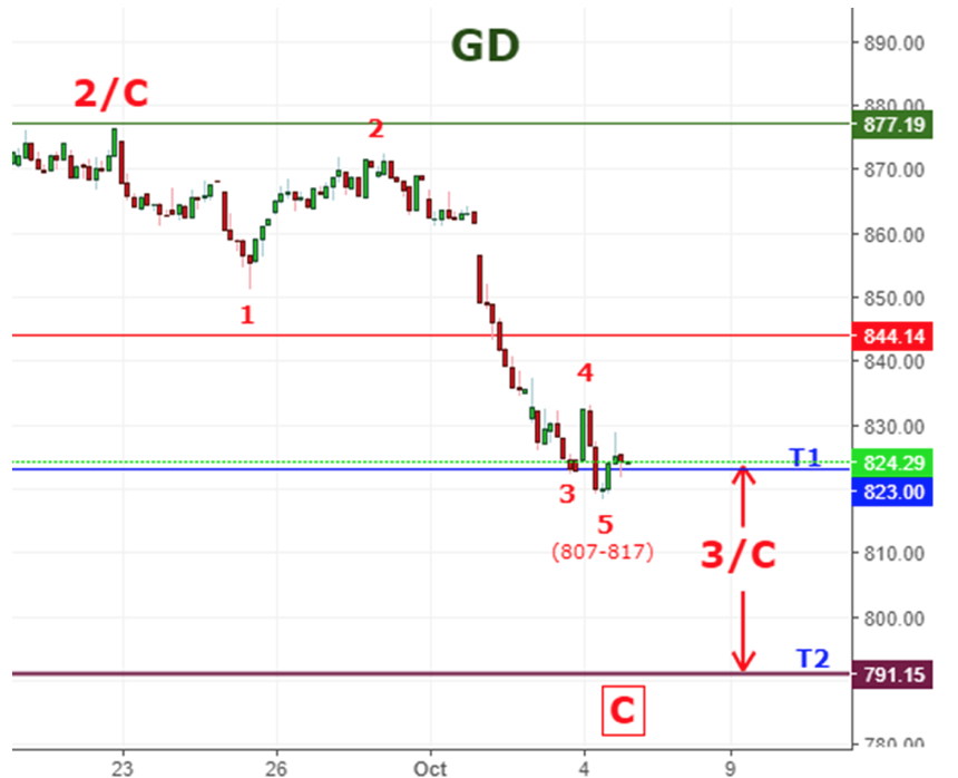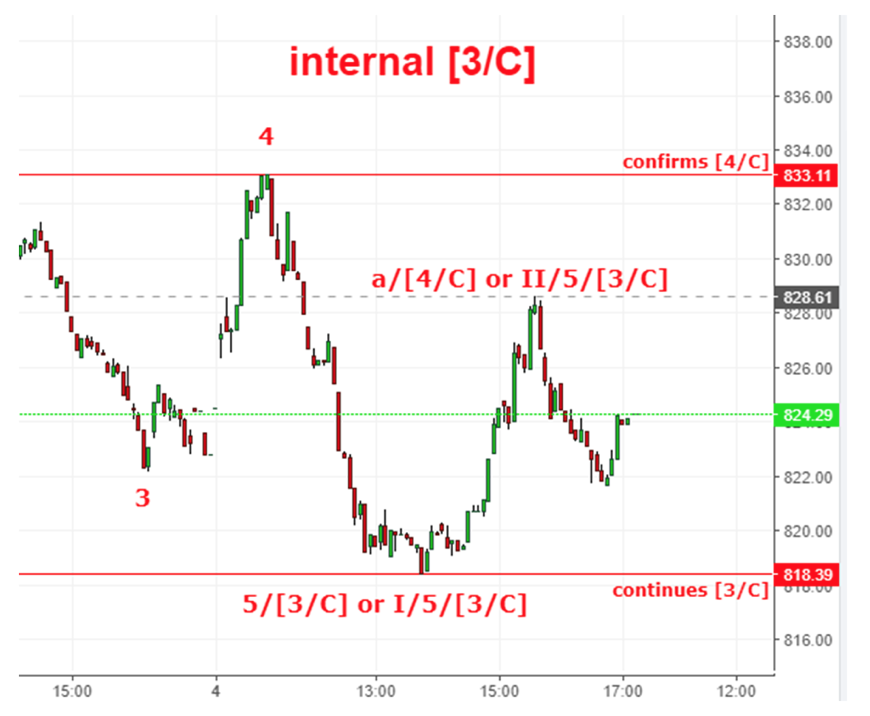 Οι τυπικοί στόχοι για το κύμα 3/C είναι στην Τ1 (823 μονάδες) που έχει ήδη επιτευχθεί και στην Τ2 (791 μονάδες) αλλά μπορεί να ολοκληρωθεί οπουδήποτε εντός αυτής της περιοχής ή ακόμη και λίγο χαμηλότερα αυτής. Η επίτευξη του πρώτου στόχου (Τ1) αφήνει ανοικτό το ενδεχόμενο το κύμα 3/C να έχει ολοκληρωθεί όμως οι πιθανότητες είναι σχετικά μικρές αφού το κύμα 5/3/C δεν έχει το ελάχιστο τυπικό μήκος (τυπικοί στόχοι του 5/3/C στις 807-817 μονάδες όπως φαίνεται στο παραπάνω διάγραμμα).
