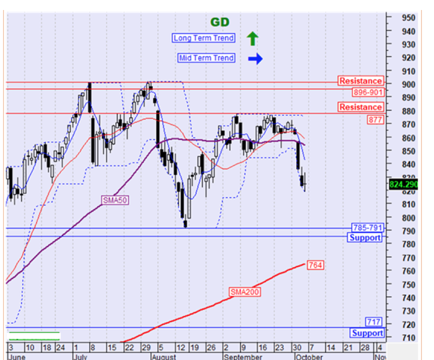 Από το διάγραμμα του ΓΔ προκύπτει ότι δεν υφίσταται κάποια σοβαρή στήριξη της τιμής μέχρι το επίπεδο των 785-791 μονάδων ενώ ακόμη χαμηλότερα βρίσκεται και ο απλός κινητός μέσος των 200 ημερών. Είναι λοιπόν αρκετά πιθανό να συνεχιστεί η διόρθωση σε ακόμη χαμηλότερα επίπεδα.