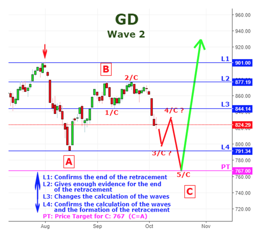 Με βάση την τρέχουσα εξέλιξη και μορφή ο τυπικός στόχος ολοκλήρωσης του κύματος C και κατ' επέκταση όλης της διόρθωσης (κύμα 2) βρίσκεται σήμερα στις 767 μονάδες. (ΡΤ line).